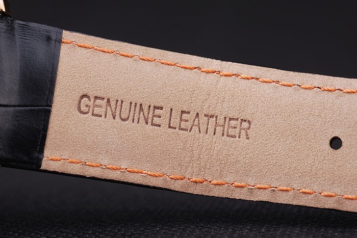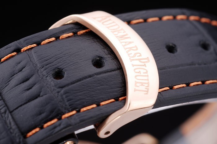 Bracelet: Svart krokodil läderrem med orange sömmar och värme präglad Audemars Piguet namn och logotyp och en Audemars Piguet inskriven 18k steg-guldpläterade flip-over krok clasp