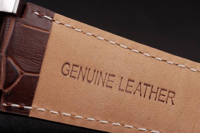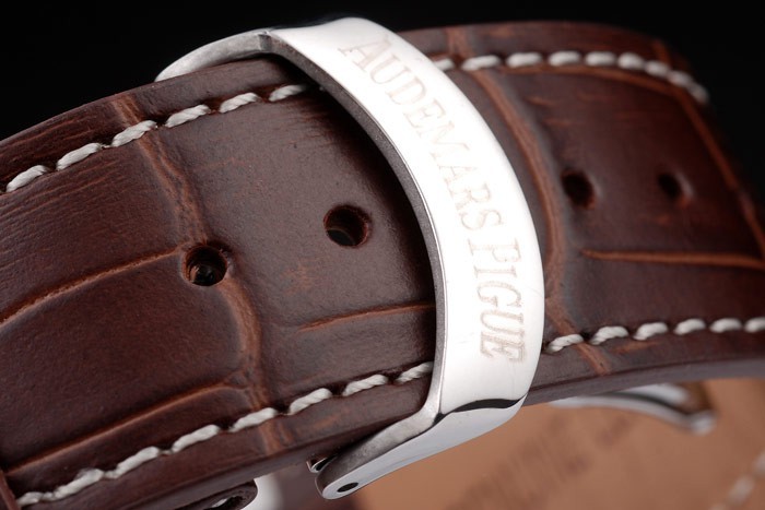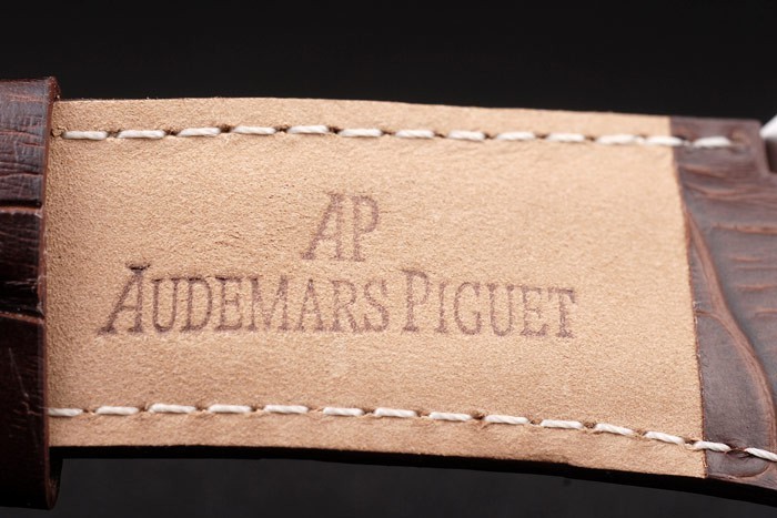Bracelet: Heat präglade Audemars Piguet brun krokodil läderband med vita sömmar och Audemars Piguet graverad rostfritt stål fold-in clasp