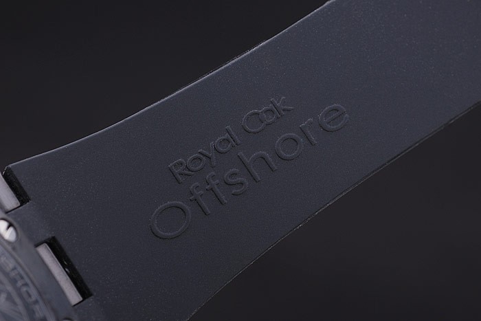 Bracelet: Svart gummiband med värme präglade Audemars Piguet Royal Oak Offshore stämpel och en Audemars Piguet inskriven jon-klädd krok-spänne clasp