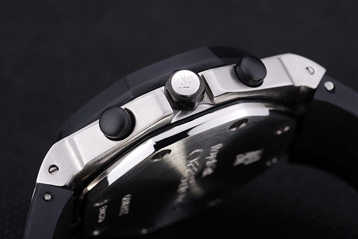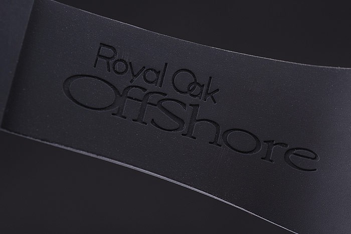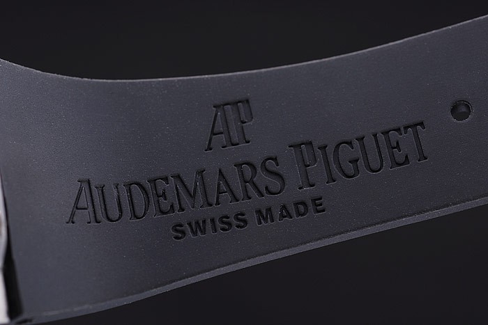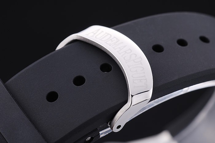 Bracelet: Svart gummiband med värme präglade Audemars Piguet Royal Oak Offshore stämpel och en Audemars Piguet inskriven rostfritt stål flip-over krok clasp