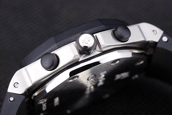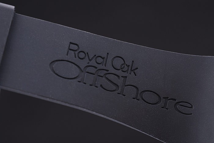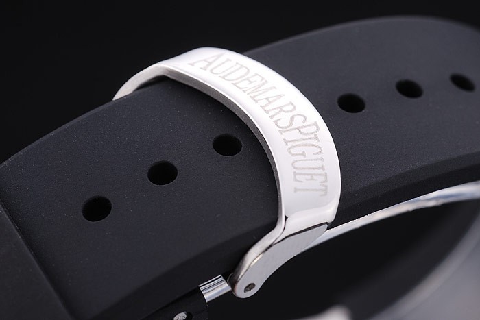 Bracelet: Svart gummiband med värme präglade Audemars Piguet Royal Oak Offshore stämpel och en Audemars Piguet inskriven rostfritt stål flip-over krok clasp