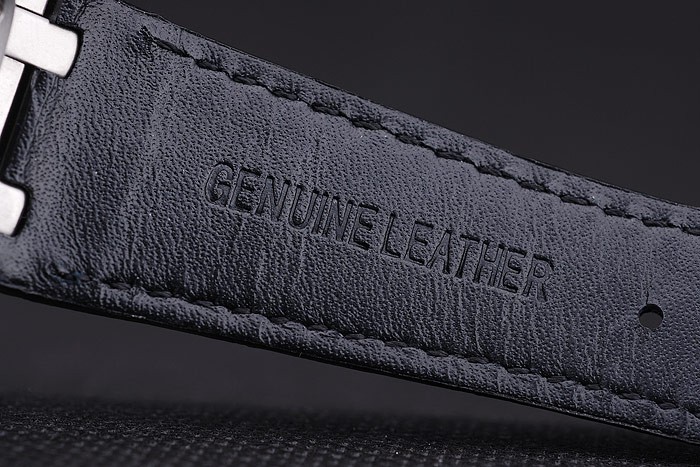 Bracelet: Svart krokodilläderband med vit tråd sömmar och värme präglad Audemars Piguet namn och logotyp och en Audemars Piguet inskriven rostfritt stål flip-over krok clasp
