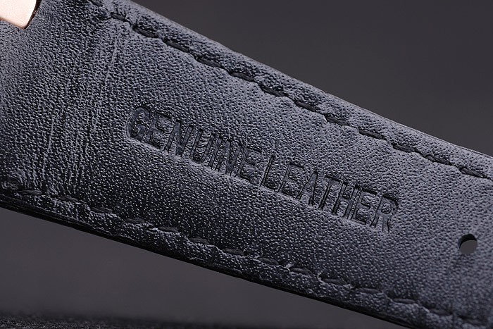 Bracelet: Svart krokodilläderband med vit tråd sömmar och värme präglade Audemars Piguet namn och logotyp och en Audemars Piguet inskriven rosen guldpläterad flip-over krok clasp