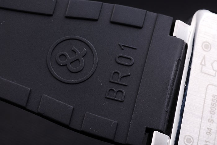 Bracelet: Svart gummiband med värme präglade logo, modellnummer och produktkod och BR graverad borstat rostfritt stål krok-spänne spänne