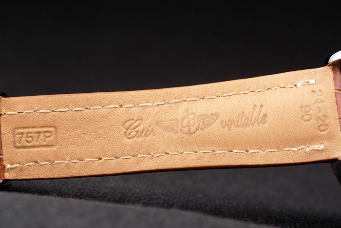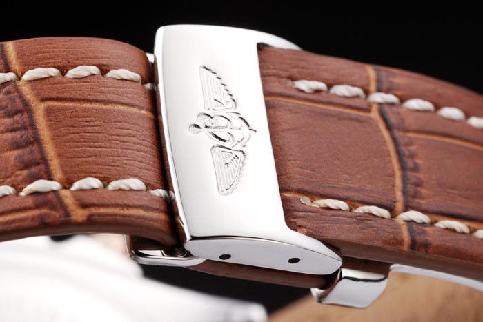 Bracelet: Brun krokodil läderrem med patent vita sömmar och värme präglade Breitling gravyrer och graverad rostfritt stål vika in lås med Breitling logotyp på top