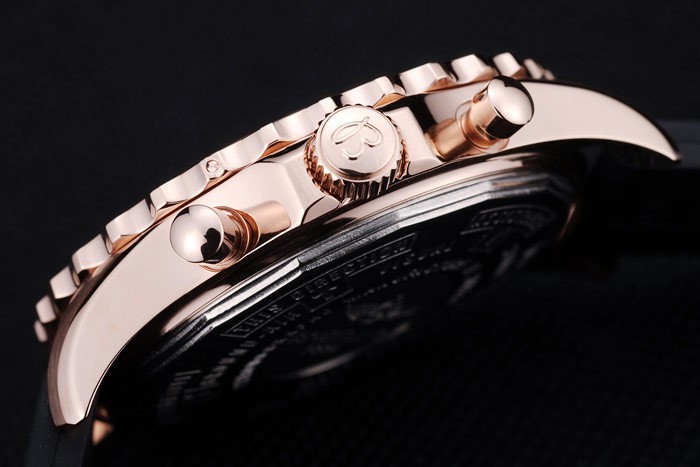 Crown: 18k steg-guldpläterade cutwork krona med Breitling logotyp och två mindre rostfritt stål tryckknappskronor på vardera sidan om it