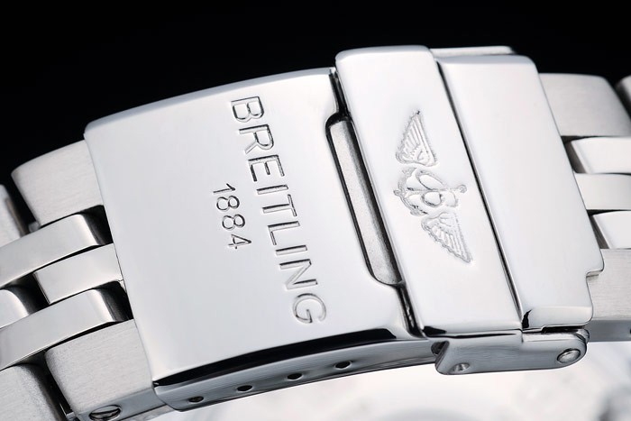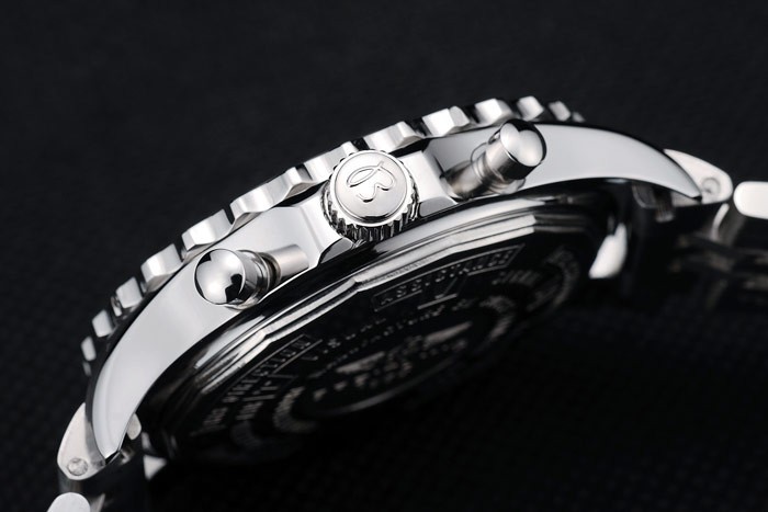 Crown: Polerat cutwork rostfritt stål krona med Breitling logotyp och två mindre rostfritt stål tryckknapps kronor på ömse sidor av it