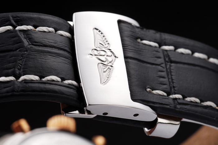 Bracelet rostfritt stål: Svart krokodilläderband med patent vita sömmar och värme präglade Breitling gravyrer och graverad rostfritt stål vika in lås med Breitling logotyp på top