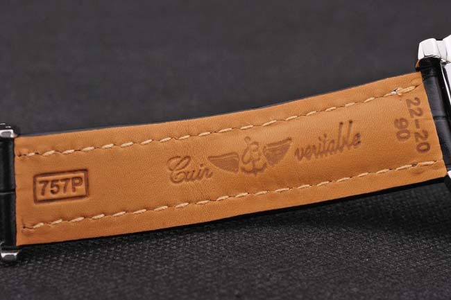 Bracelet: Svart hög kvalitet läder i en krokodil mönster , med tung vit bomull sömmar. Tan inre band präglad med Breitling namn och logotyp, och har en stål spänne closure.