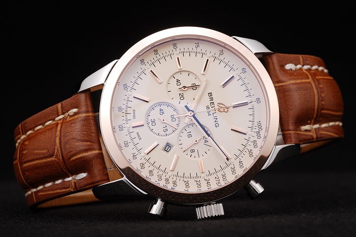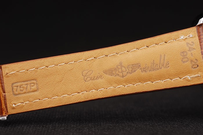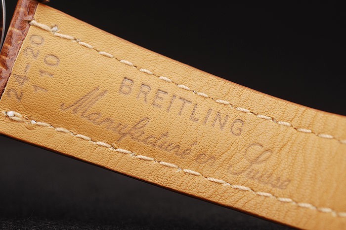 Bracelet: Heat präglade Breitling brun krokodil läderband med vit tråd sömmar och en Breitling logotyp ingraverad fold-in rostfri clasp
