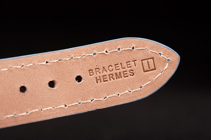 Bracelet: Ljusblå läderrem med värme präglade stämpel Armband Hermes och Hermes grav polerat rostfritt stål krok-spänne