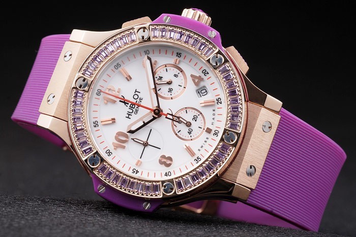Bracelet: texturerad lila gummiband med rose-guld tryckknapp krok lås och Hublot engravings