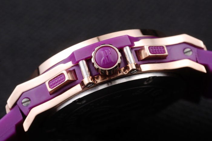 Crown: Cutwork rose-guldkrona med “H” gravyr och två rektangulära tryck knapp kronor på vardera sidan, alla översållad med lila gummi trimmings