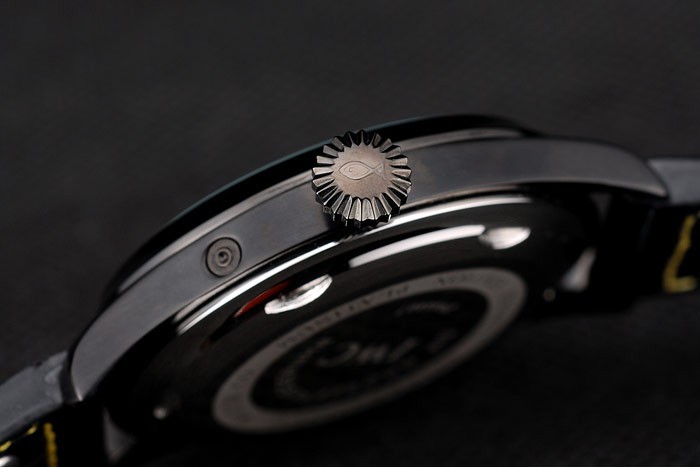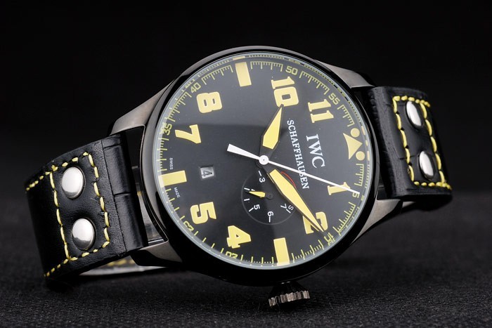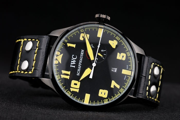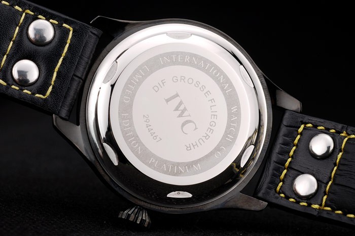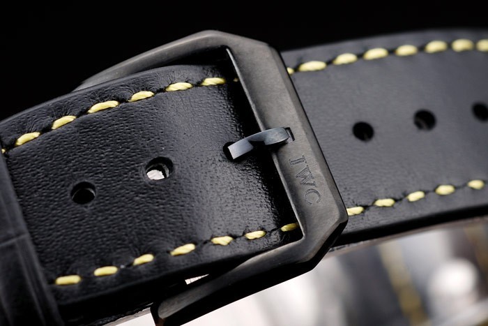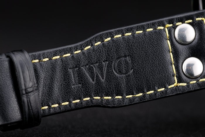 Bracelet rostfritt stål: IWC värme präglat svart krokodil läderrem med gula sömmar tråd och IWC graverad jon-klädd rostfritt stål krok spänne clasp