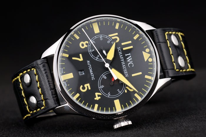 Bracelet stål: IWC värme präglat svart krokodil läderrem med gul tråd sömmar och graverade borstat rostfritt stål krok-IWC clasp