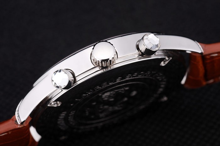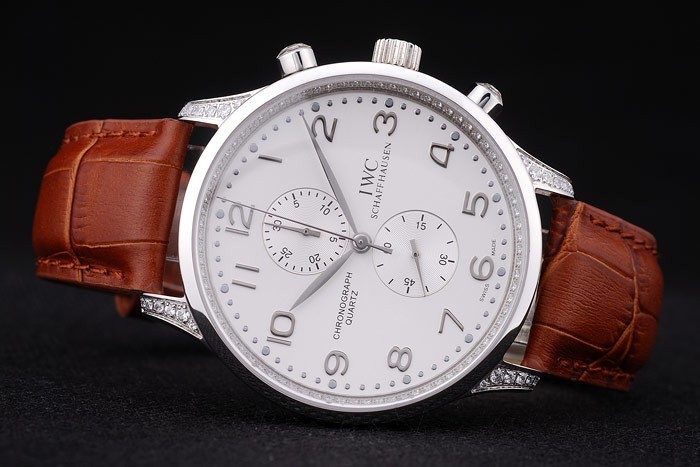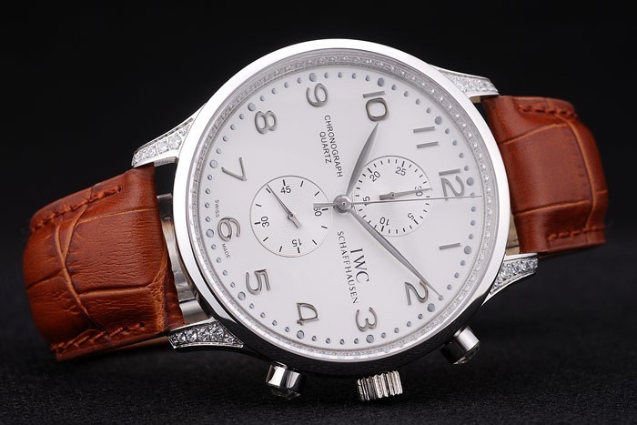 Crown: Polerat cutwork rostfritt stål krona med IWC logo gravyr och två mindre runda tryckknapps kronor på ömse sidor om it