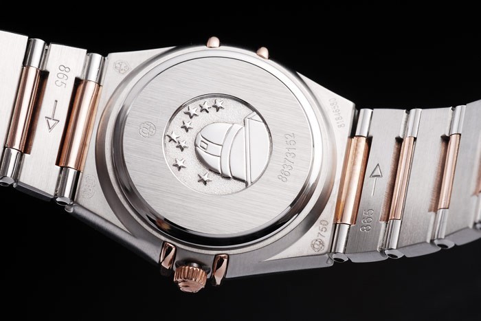Bracelet: borstat rostfritt stål och rose-guld kedjelänk armband med dold lås och Omega logo på top