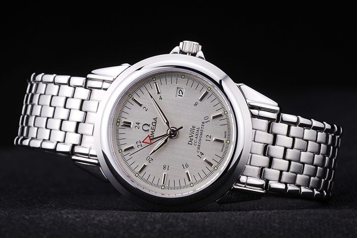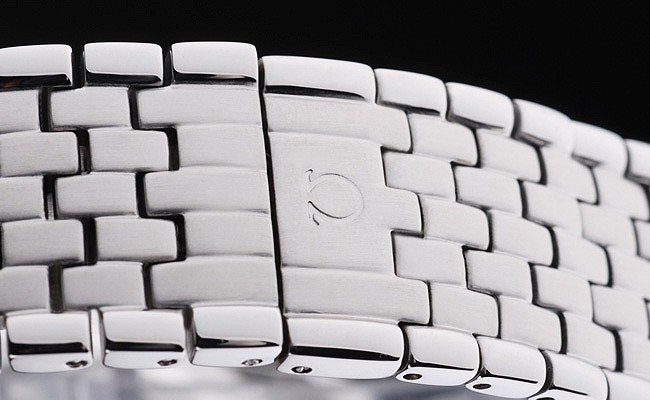 Bracelet: borstad och polerat rostfritt stål länk armband med Omega logotyp ingraverad dold clasp
