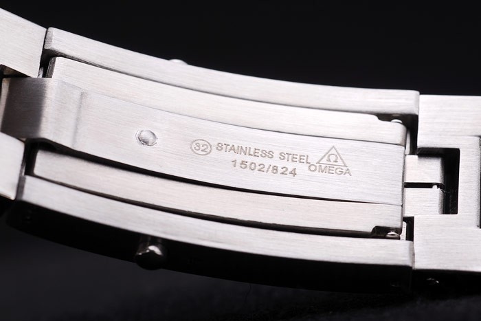 Crown: polerat cutwork rostfritt stål krona med Omega logotyp plus en liknande krona på den motsatta toppen corner
