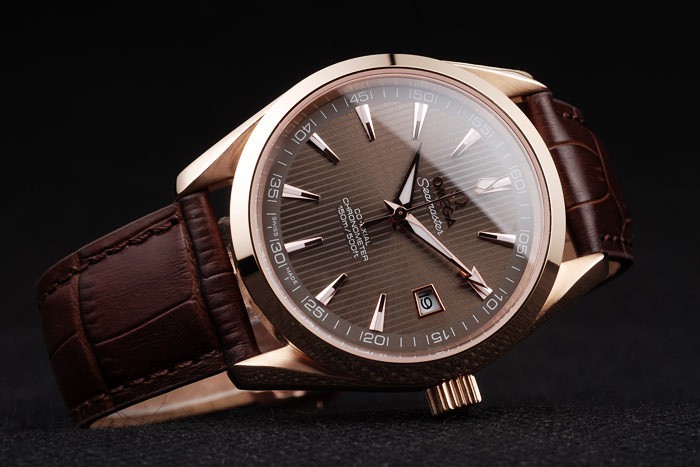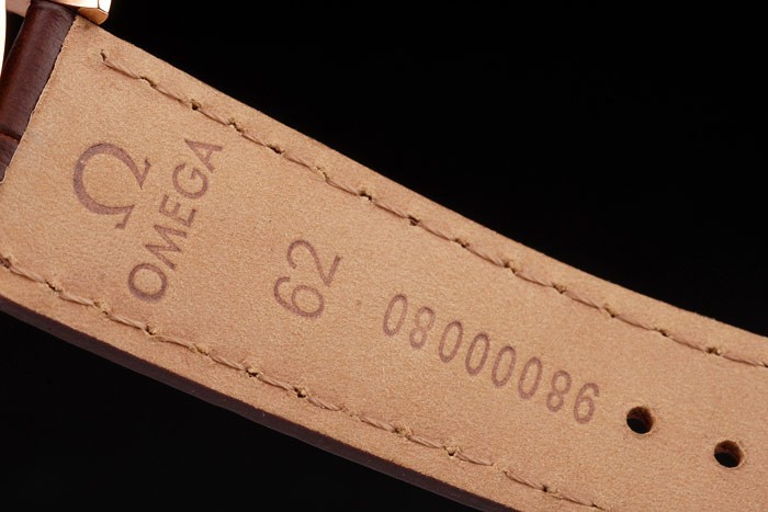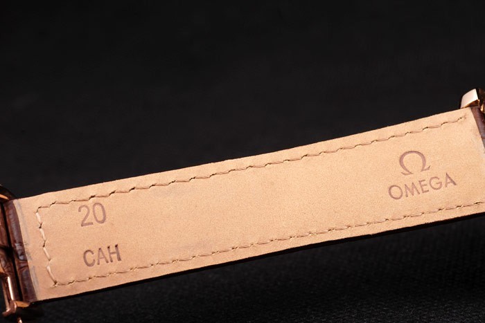 Bracelet: Brun krokodil läderrem med värme präglade Omega stämpel och Omega inskriven 18k rose-guld vika in clasp