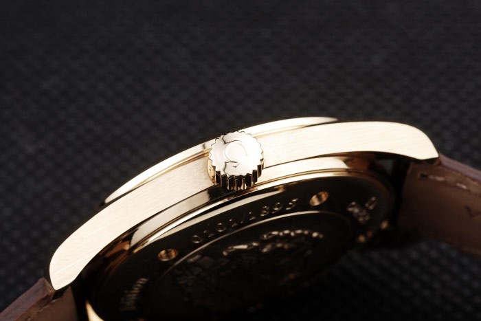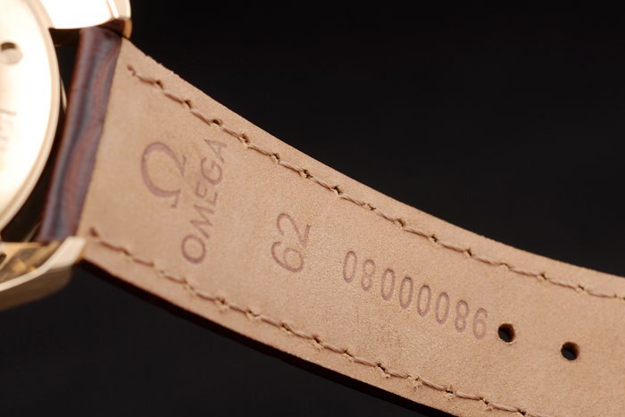 Bracelet: Brun krokodil läderrem med värme präglade Omega stämpel och Omega inskriven 18k gult guld fold-in clasp