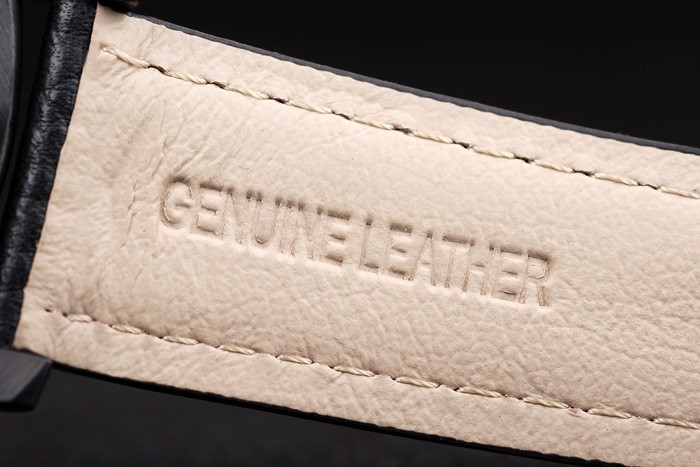 Bracelet: Svart läderrem med vita sömmar och värme präglade Luminor Panerai stämpel och jon-plated rostfritt stål krok spänne spänne med Panerai engraving