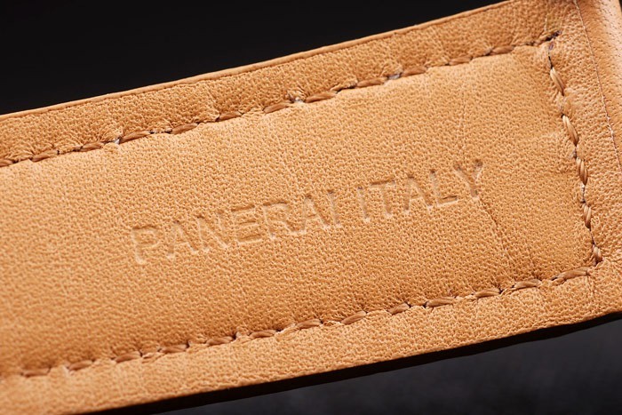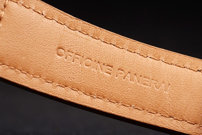 Bracelet: Ljusbrun läderrem med värme präglade Officine Panerai Italien stämpel och borstat krok i rostfritt stål -buckle lås med Panerai engraving