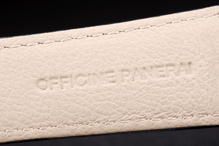 Bracelet rostfritt stål: Svart krokodil läderrem med vita sömmar och värme präglade Officine Panerai Italien stämpel och polerat rostfritt stål krok spänne spänne med Panerai engraving