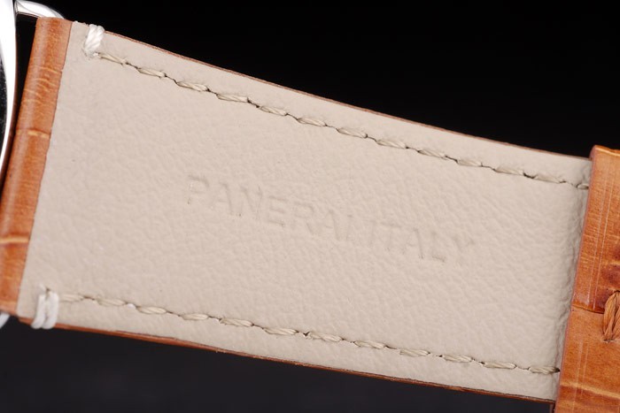 Bracelet: Brun krokodil läderrem med vita sömmar och värme präglade Officine Panerai Italien stämpel och polerat rostfritt stål krok spänne spänne med Panerai engraving