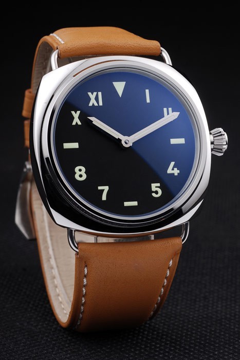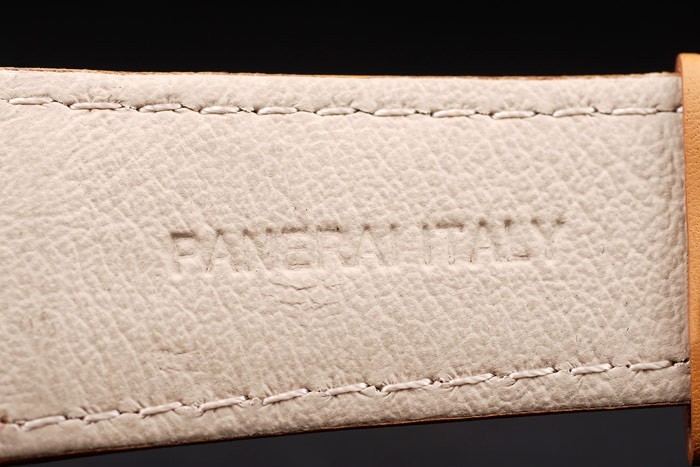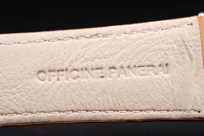 Bracelet: Ljusbrun läderrem med vita sömmar och värme präglade Officine Panerai Italien stämpel och polerat rostfritt stål krok spänne spänne med Panerai engraving