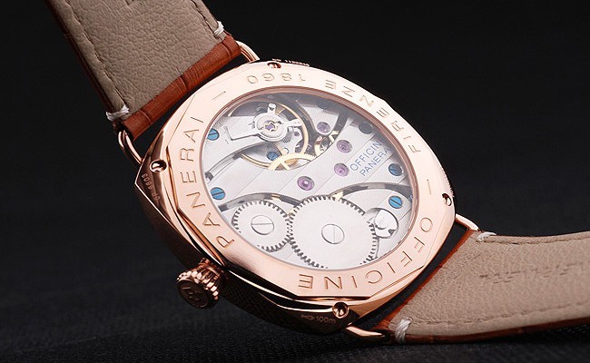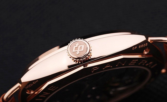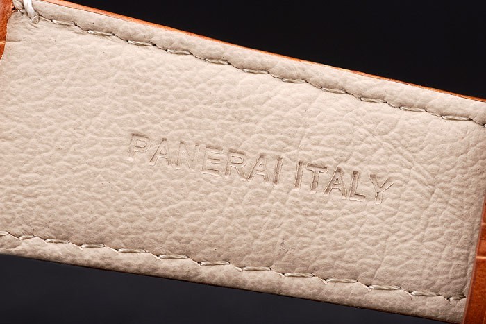 Denna klocka har AR glas. Ansiktet färg visas olika färger beroende på hur ljuset faller på itBack: skruv, fast 440 rostfritt stål, graverad med Panerai name
