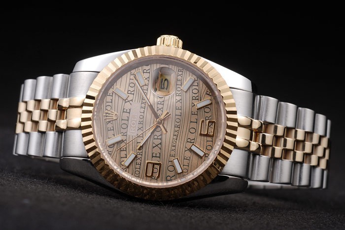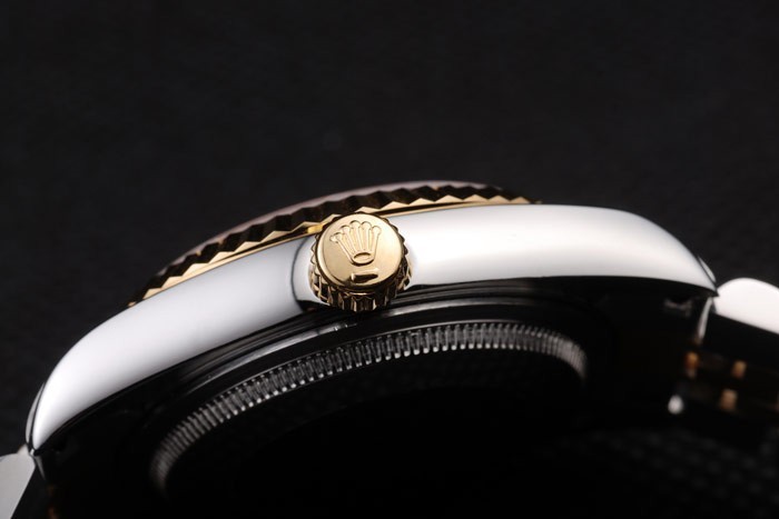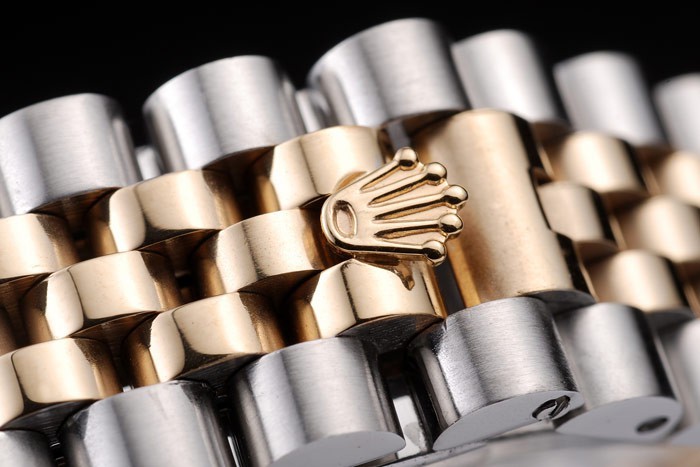 Bracelet: Två tonad länk armband i borstat rostfritt stål och 18k gult guld stål med Rolex graverad dold spänne visar Rolex logo
