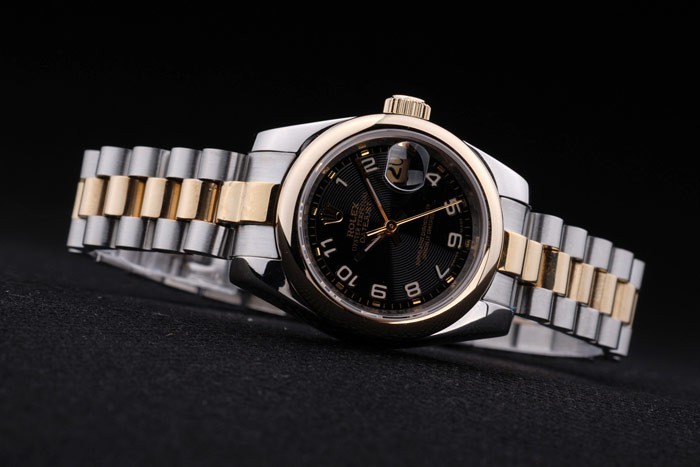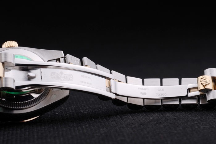 Bracelet: Två tonad trippel länk armband i polerat rostfritt stål och 18k gult guld stål med Rolex gravyr gömd lås visar Rolex logo