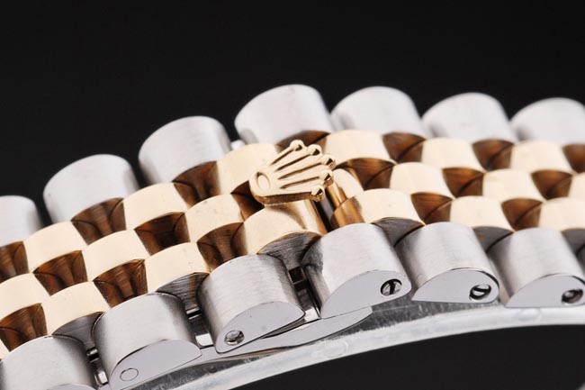 Bracelet: borstat rostfritt stål och gult guld kätting med vika över lås och Rolex krona engraving