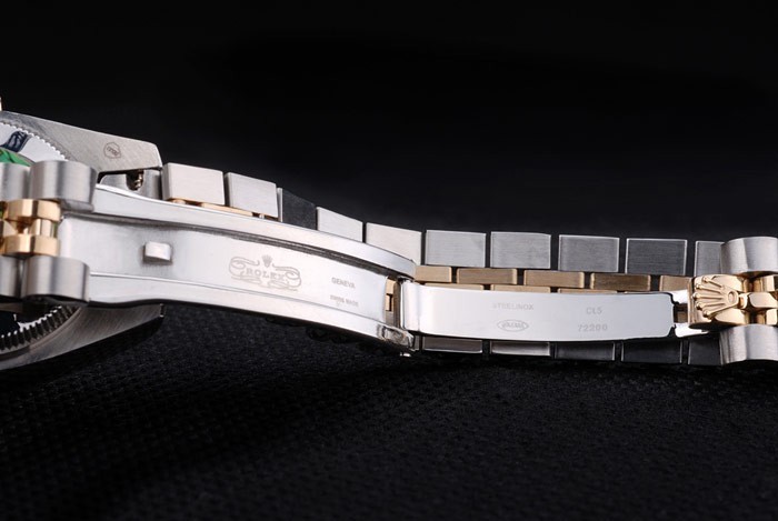 Bracelet: Två tonad länk armband i borstat rostfritt stål och 18k gult guld stål med Rolex gravyr dold spänne visar Rolex logo