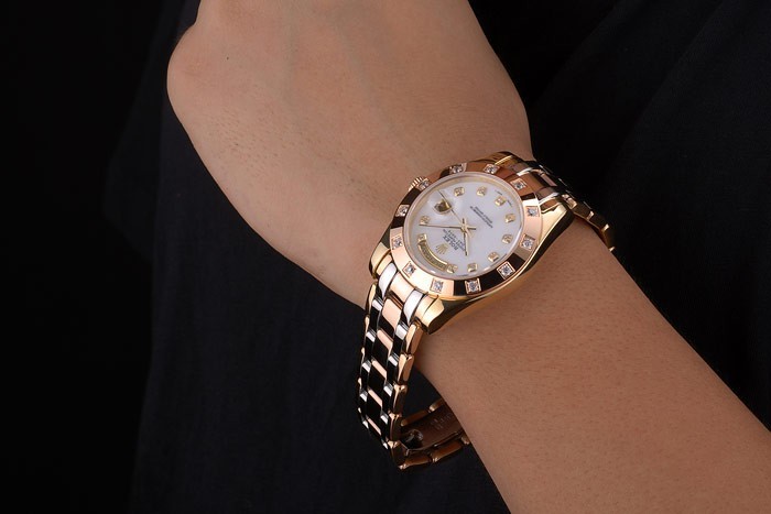 Bracelet: Polerad och guld ton rostfritt stål länk armband med Rolex gravyr gömd lås visar Rolex logo