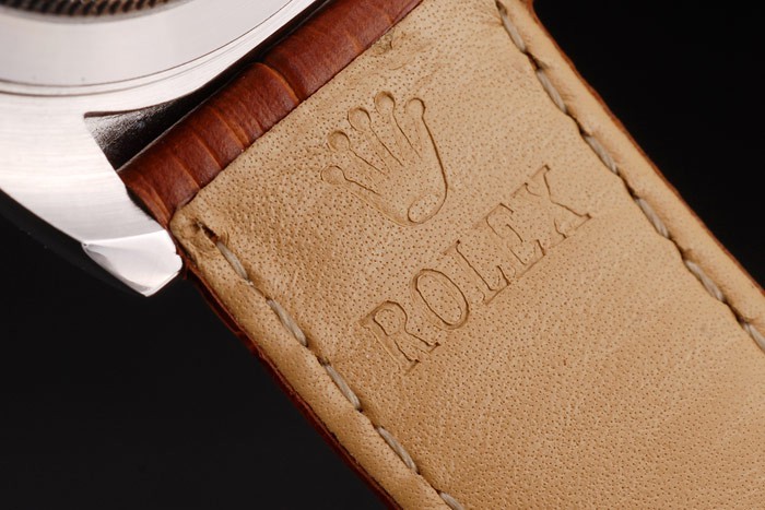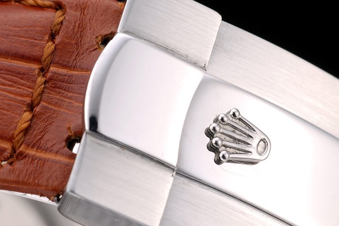 Bracelet: Rolex värme präglat brunt krokodil läderrem med graverad rostfritt stål utbyggnad lås med Rolex logotyp på top