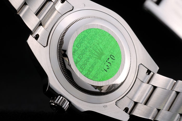 Tillbaka: Rostfritt stål snap-in tillbaka med grön Rolex äkthet sticker
