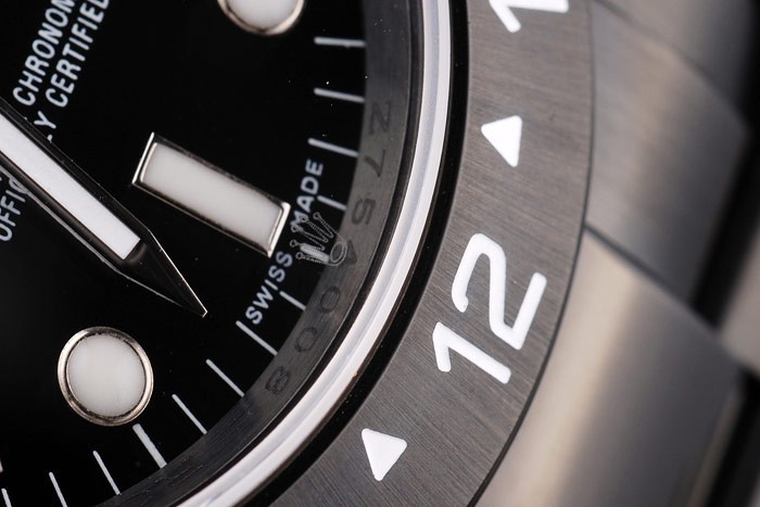 Bezel: Svart keramisk cutwork bezel med silver siffra 24-timmars markers