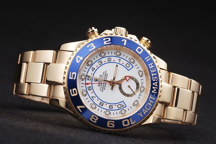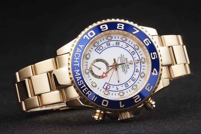 Bezel: Gul guldpläterad enkelriktad cutwork bezel med en till 10 markeringar och Yacht master gravyr på en blå emaljerad background