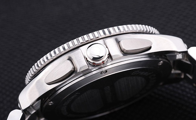 Bezel: Polerat cutwork rostfritt stål bezel med glansig svart tachymeter