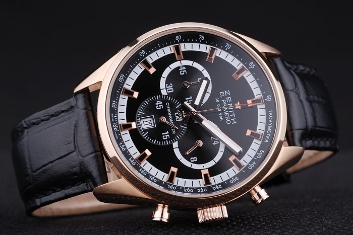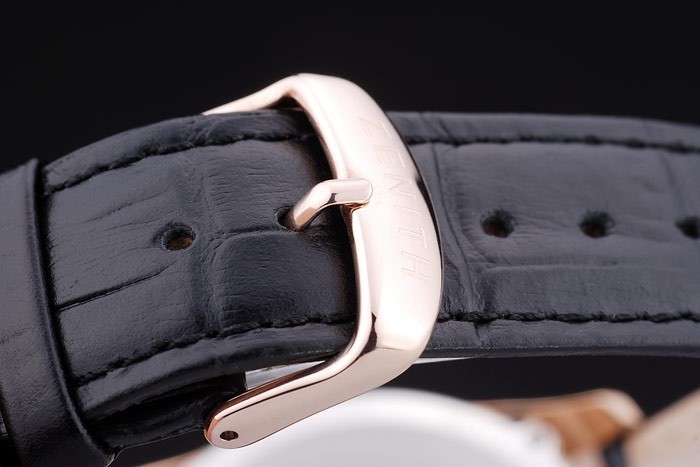 Crown: Rose-guldpläterad cutwork krona med Zenith stjärna logotyp gravyr och två mindre runda tryckknapps kronor på ömse sidor av it